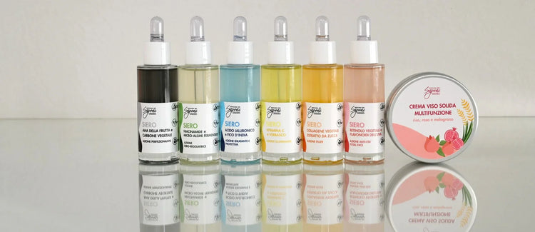 Una skincare versatile ed essenziale: i sieri viso specifici per le tue esigenze e la crema solida possono essere usati singolarmente o combinati per un trattamento completo e personalizzato.
