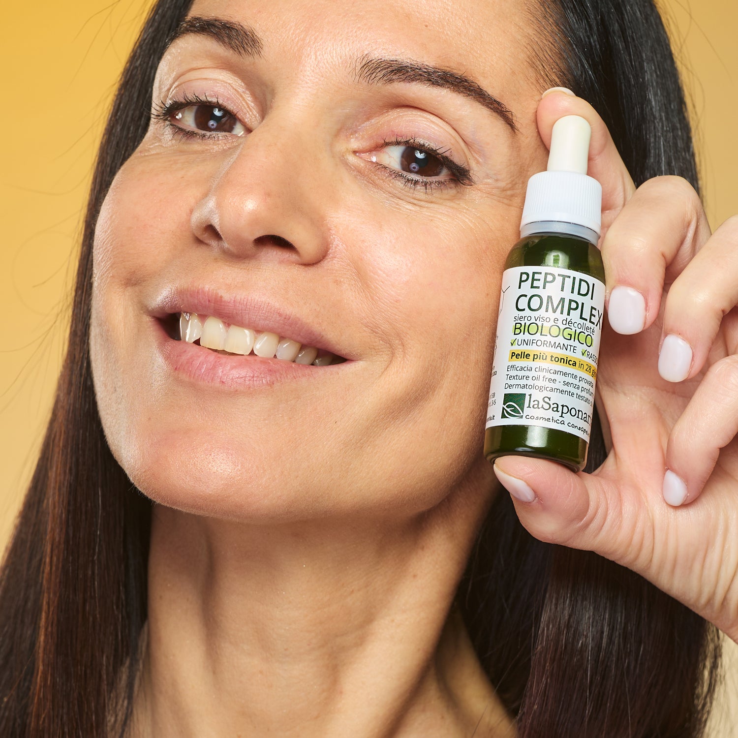 Peptidi Complex contiene un esapeptide (6 amminoacidi) di origine vegetale derivato da fermentazione e l’estratto – ricco in peptidi - di Sacha Inchi, una pianta perenne del Sud America, conosciuta e utilizzata per le sue straordinarie proprietà già dagli Inca. La combinazione di questi due ingredienti agisce in modo efficace e completo sul ringiovanimento del viso e del décolleté: migliorando il tono della pelle, contrastando il naturale cedimento cutaneo e combattendo i segni del tempo come rughe, perdita di elasticità e macchie. La pelle di viso e seno apparirà più uniforme, compatta e rassodata.