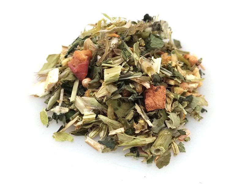 Verge d'or, galega, prêle, herbes épicées sidérites, ortie, citronnelle, écorces d'agrumes (citron, orange, mandarine), graines de coriandre, fenouil, cardamome, pomme, gingembre.