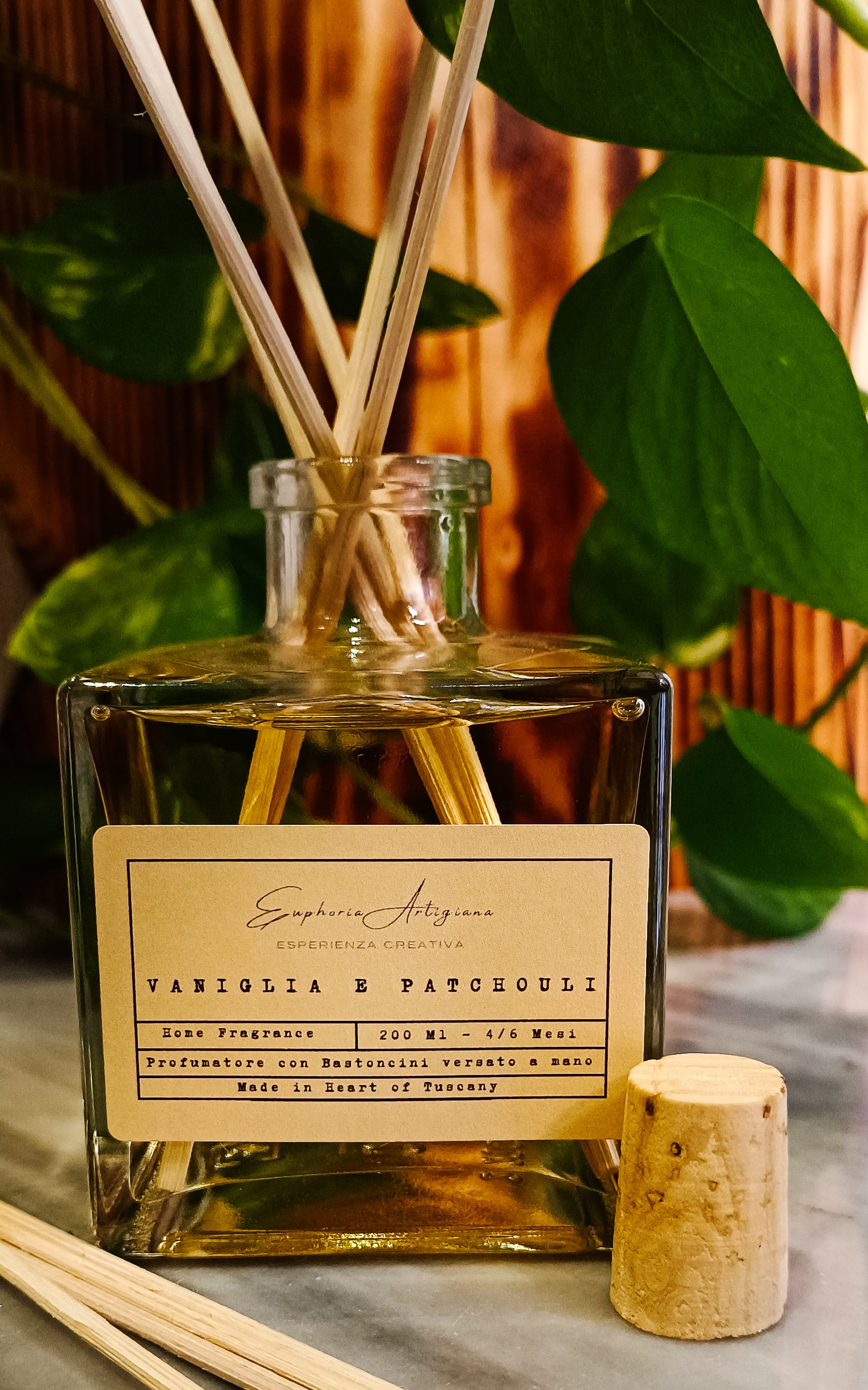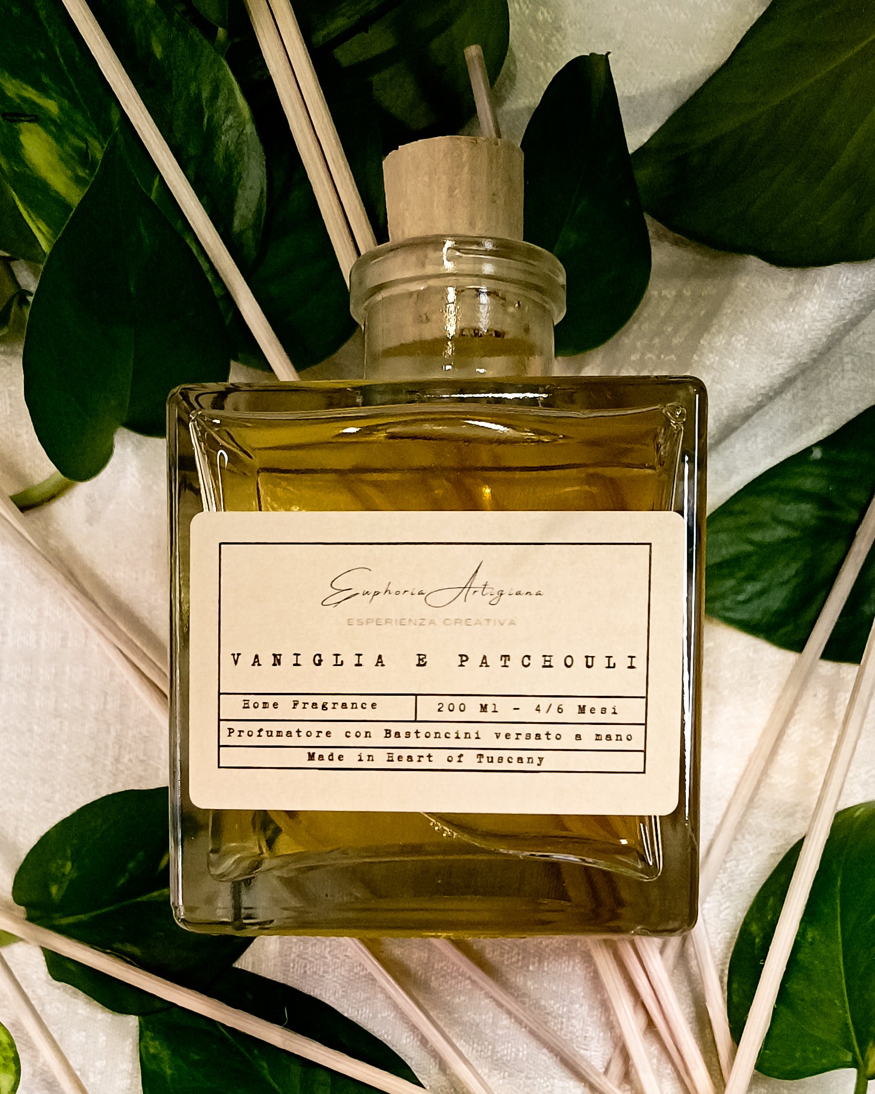 Profumatore con Bastoncini VANIGLIA E PATCHOULI, versato a mano con amore.